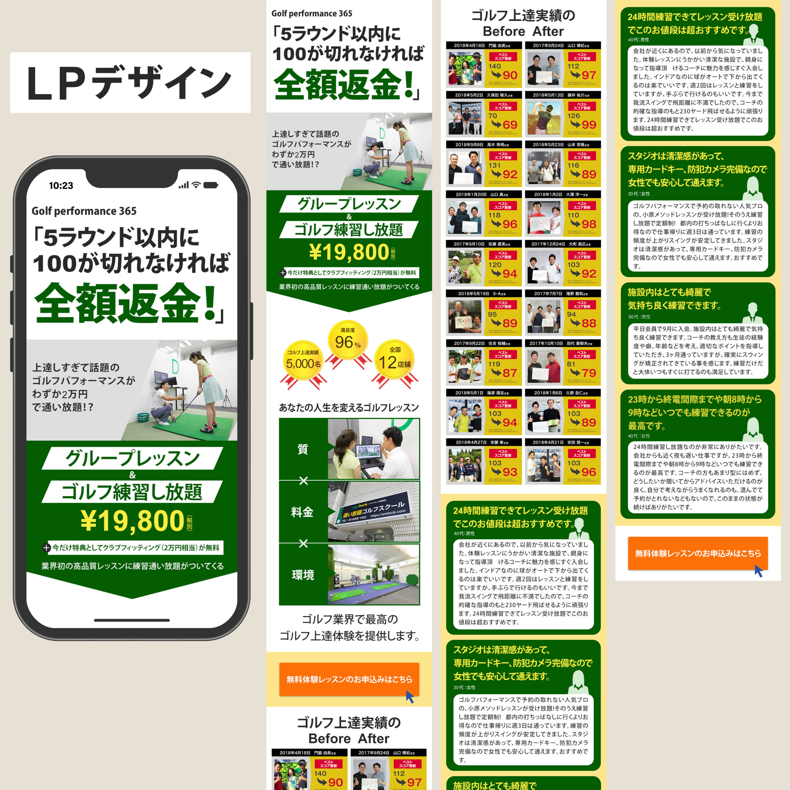 「5ラウンド以内に100が切れなければ全額返金!」というレターを強調することで信頼感を表現し、グループレッスンとゴルフ練習し放題のお得感が訴求できるように作成しました。
